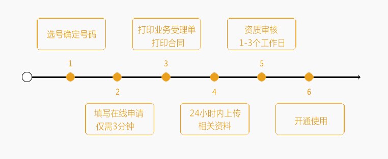 新号开通流程: 选择号码 → 填写申请表 → 准备资料(营业执照复印件、法人身份证复印件、申请表、服务协议、安全承诺书加盖公章) → 支付款项 → 号码开通使用。